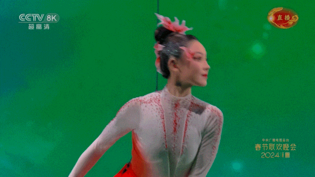 這支舞有擬態的效果,舞者們還原的是喜鵲在枝頭躍動、轉圈、翱翔的靈動姿態。領舞華宵壹有壹個獨舞片段,她需在 1 拍半內借助吊環完成高速旋轉,寓意是喜鵲騰空翻飛,而這樣的技術動作“目前僅有她的能力和力量能夠完成”。