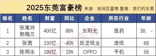 在新鮮出爐的《2025胡潤百富榜》中,張寓帥與母親郭梅蘭以400億財富值打敗了常年登頂東莞首富的玖龍紙業張茵家族,壹躍成為東莞新首富。