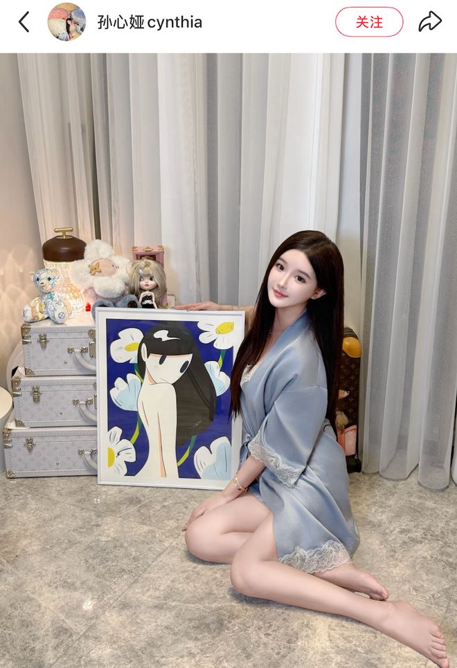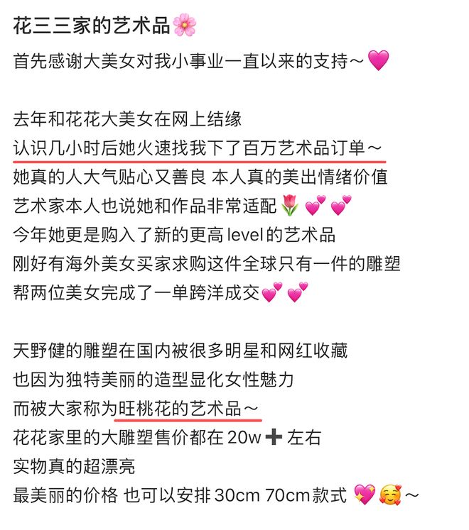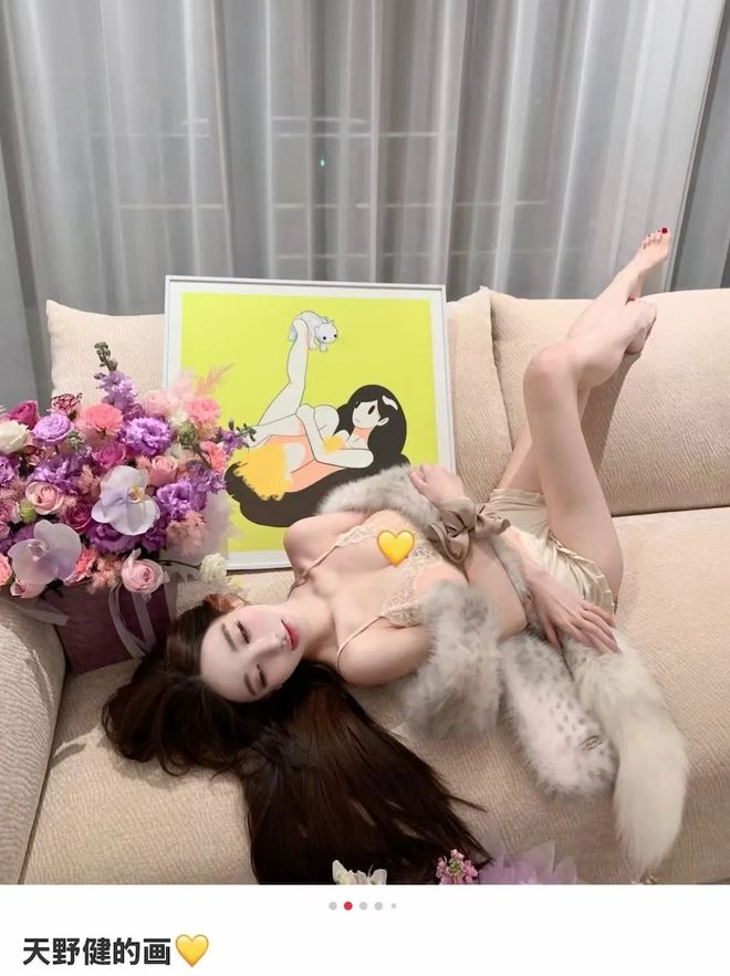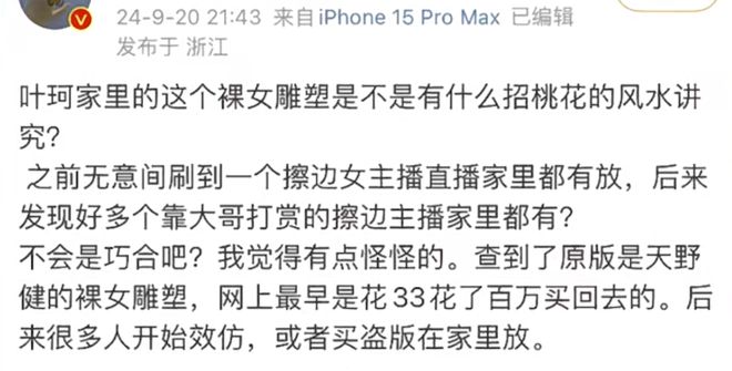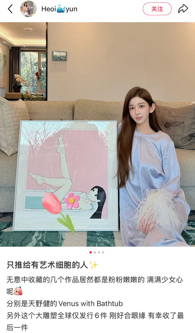 大概覺得花叁叁的確很招桃花,導致天野健的作品壹路看漲,網紅圈、名媛圈基本上人手天野健,比如葉珂家裡也有壹個小號雕塑: