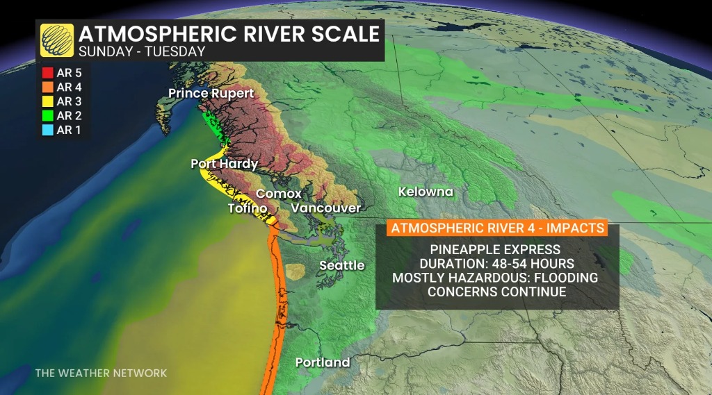 氣象部門表示,這次大氣河流強度預計達到 4 級(AR-4),屬於高影響級別事件。由於其將大量熱帶水汽直接輸送至西海岸,也被稱為“菠蘿快車”。