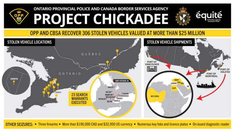 “小山雀行动”始于 2023 年 8 月,当时由安省警察局领导的省级汽车盗窃和拖车 (PATT) 小组的警员在大多伦多地区找回了四辆被盗车辆。