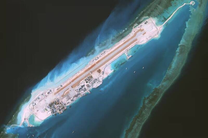 越南在南沙群岛柏礁(Barque Canada Reef)进行大规模填海造陆,卫星影像清晰可见1条长约2.4公里的飞机跑道已具雏形,显示其强化军事投射能力的意图。 (撷取自CSIS亚洲海事透明倡议)