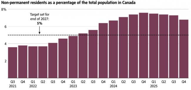 目前,非永久居民占加拿大總人口的比例已從7.3%降至6.8%。聯邦政府此前設定的目標,是在2027年前將這壹比例降至5%左右。
