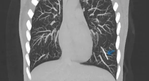 通过CT检查,医生在一位英国女性的肺里发现了意想不到的东西:一根失踪多年的避孕植入物[8]。