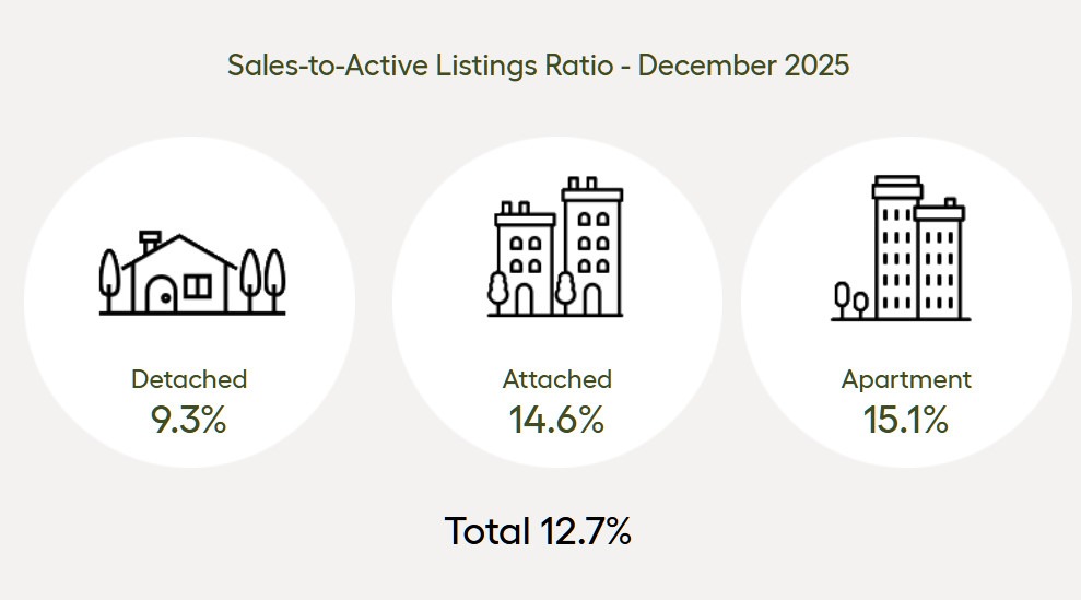 2025年12月,所有獨立式住宅、聯排住宅和公寓的銷售與活躍掛牌房源比率為12.7%。按房產類型劃分,獨立式住宅的比率為9.3%,聯排住宅為14.6%,公寓為15.1%。