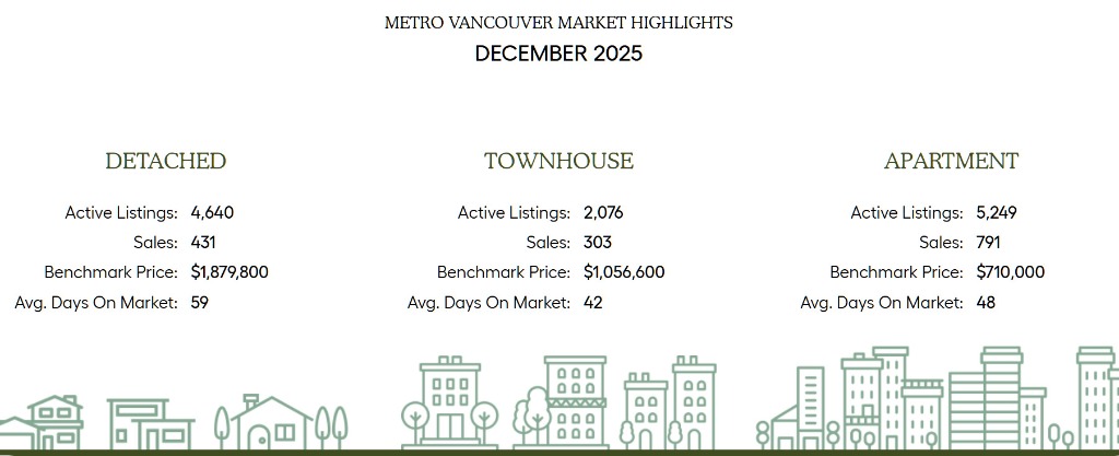 - 2025年12月獨立式住宅銷量為431套,較2024年12月的494套下降12.8%。獨立式住宅的基准價格為1,879,800加元,較2024年12月下降5.3%,較2025年11月下降1.1%。