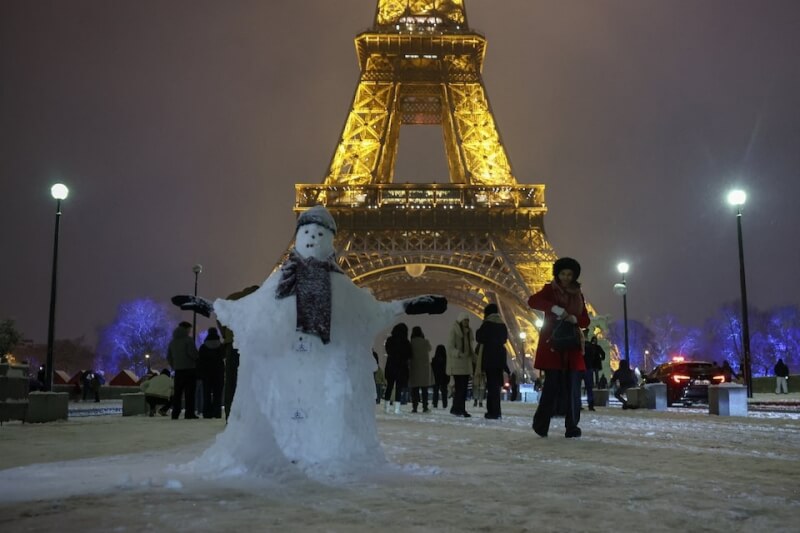 法国民众在巴黎铁塔前堆起雪人。(路透社)