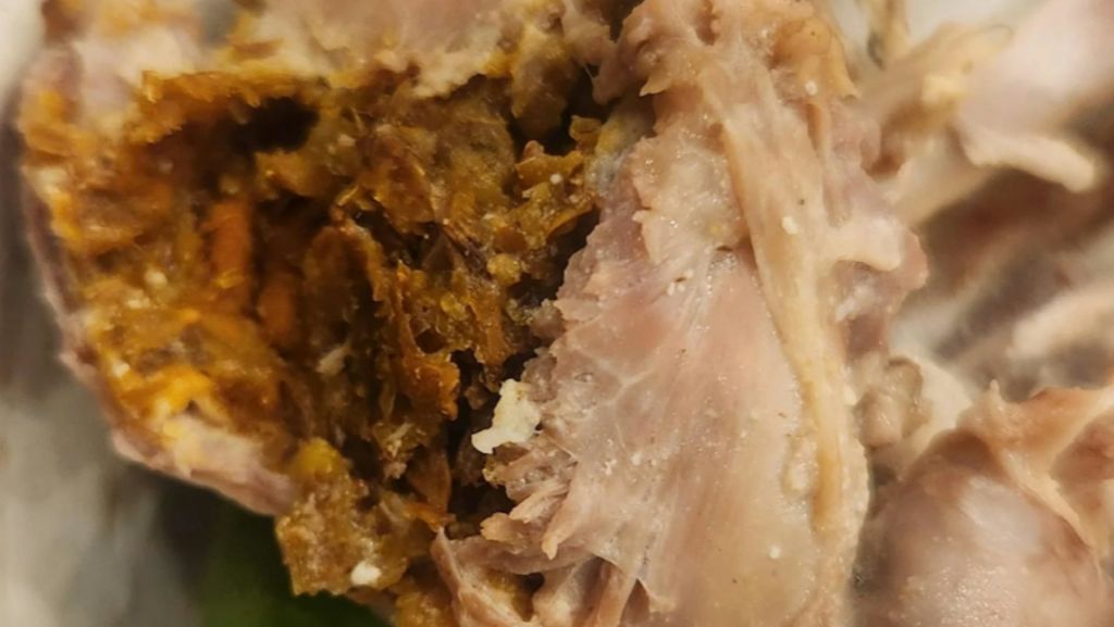 看起来那个被指为『鸡屎』的部位,实际上是鸡的砂囊。本应在屠宰加工时就移除,但供应商显然漏掉了这个程序。