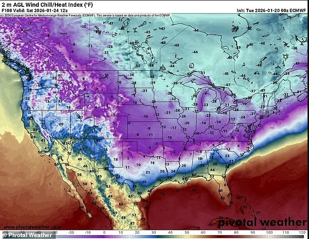 氣象預測顯示,部分地區體感溫度將低至零下50華氏度(約-45℃),降雪、雨夾雪和凍雨累計可達18英寸(約45厘米)。受影響人口預計高達2億人。National Weather Service(NWS)已對多地發布“危及生命的嚴寒”警告。在北部平原和伍大湖區域,北達科他、密歇根等州的氣溫將降至-15°F至-30°F,部分地區風寒效應可達-50°F。