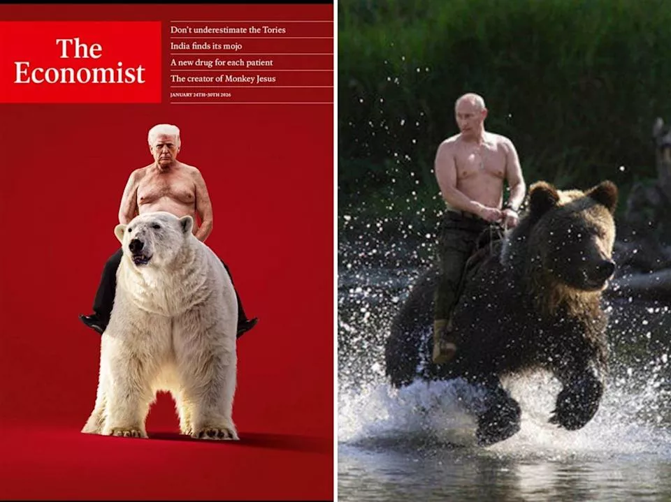 《經濟學人》以“川普造成的真正威脅”為題發表文章示警,封面用“川普赤裸上身騎北極熊”AI圖,諷刺意味濃厚。(圖/經濟學人X帳號)