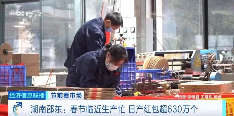 而在生产车间里,机器24小时运转,工人们轮班赶工。目前订单已排到今年3月份。随着市场需求扩大,当地的红包生产逐步走向规模化,如今已形成涵盖设计、印刷、加工、包装等环节的完整产业链。