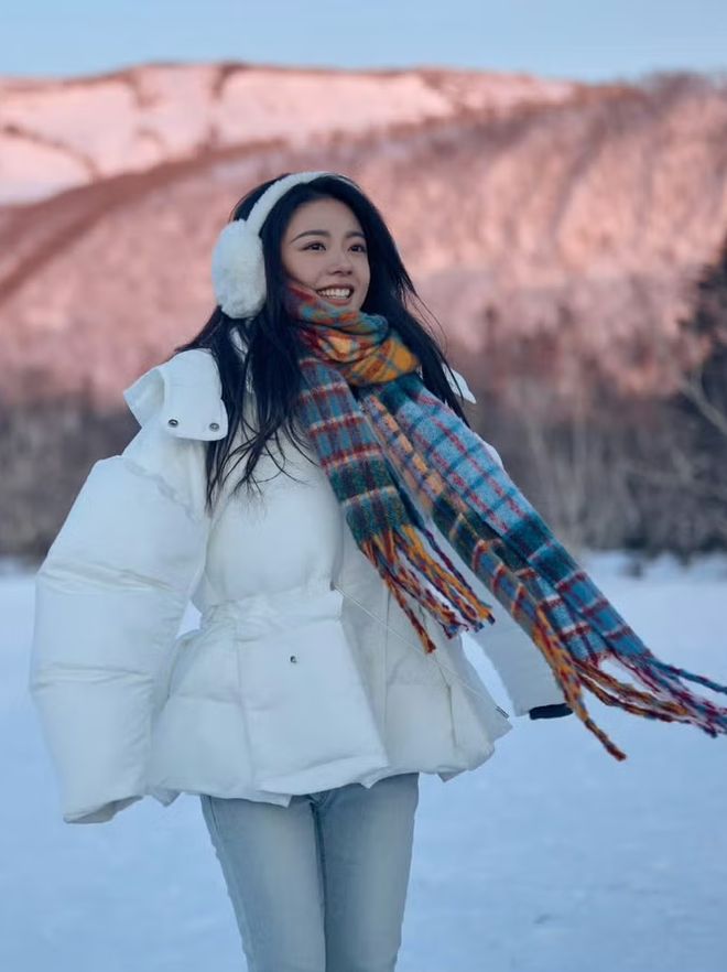 和家人壹起去長白山旅游時,麥麥穿了壹身白色羽絨外套,搭配牛仔褲,很日常的冬日 ootd,但她用配飾為整套造型增加了亮點,用耳罩、帽子、圍巾點亮全身造型,也增加了冬季穿搭的層次感。