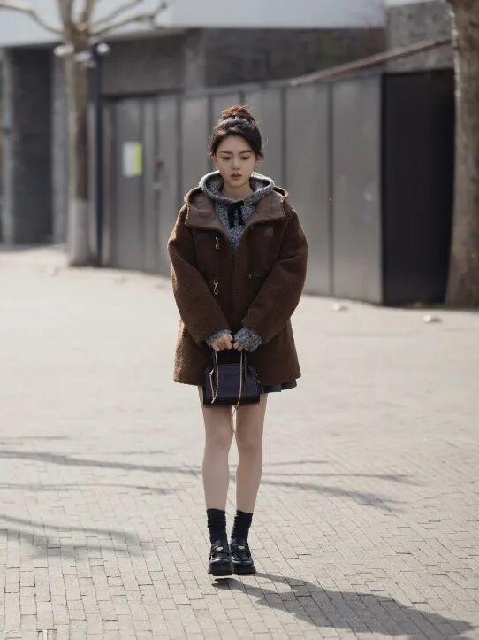 出席朋友聚會時,選擇了壹件 SHUSHU/TONG 的灰色連帽上衣搭配 Miu Miu 短裙,外套是壹件非常秋冬的美拉德泰迪熊牛角扣大衣,來自 d’zzit,復古又時髦,下裝消失造型展現完美腿部線條。