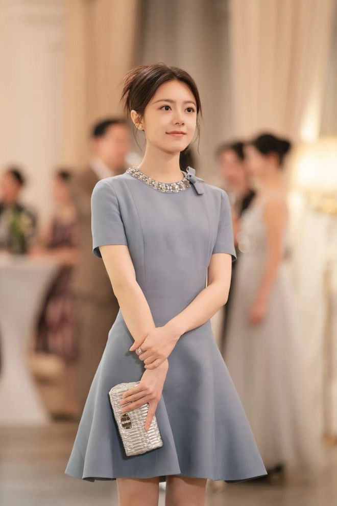 出席商業活動,穿了壹條霧霾藍小禮服,很適合麥麥甜美親和的風格,領口處有蝴蝶結設計,增加了造型感。