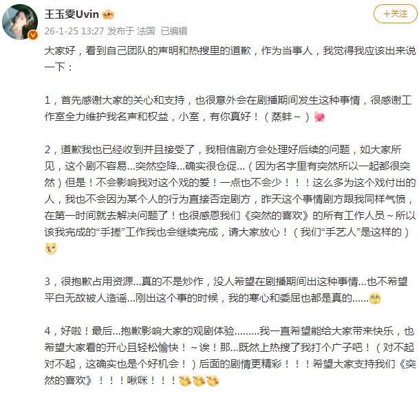 人在巴黎的王姐,看到热搜和剧方道歉,也跟着发了条微博。她强调真的不是炒作,她的寒心和委屈都是真的,但她接受剧方的道歉,并且相信他们会处理好后续问题。