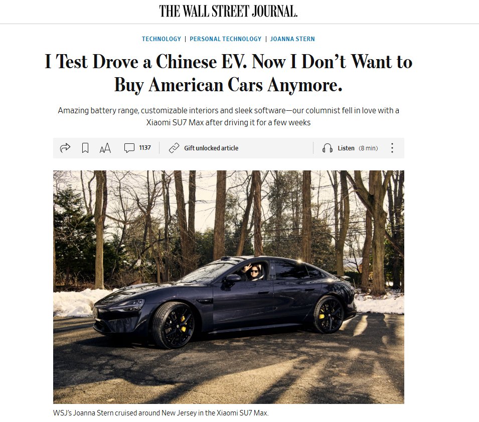 这是《华尔街日报》科技专栏作家乔安娜·斯特恩(Joanna Stern)写给中国电动汽车的一封“情书”。斯特恩最近在美国新泽西州驾驶小米SU7 Max两周后,彻底爱上了这款中国电动汽车。“试驾中国电动汽车的体验如此美好,我再也不想买美国车了。”她在1月30日发表的一篇文章中,讲述了自己对小米汽车的深刻印象。