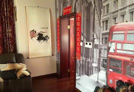 最让我无语的是休闲室的装修,墙上竟然贴了外国街头风景的壁画,然后旁边又贴了对联