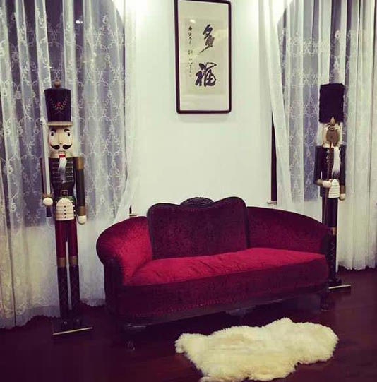 另一个房间,欧式的沙发和人偶,墙上却挂着传统的书法作品