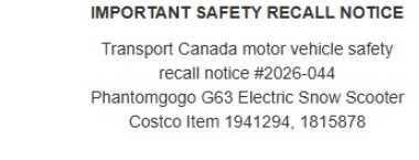 根據Costco官網公布的信息,此次召回涉及 Phantomgogo G63 電動雪地滑板車(Electric Snow Scooter)。該產品在加拿大交通部《機動車安全法規》下被歸類為雪地摩托車。