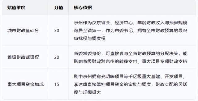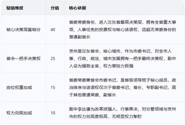 我們可以利用含權量計算公式:Q=(S+C)/Z,高育良是省委副書記兼省政法委書記,他的職務是省部級副職,也就是副部級,省委排名是第叁名,擁有全省幹部的人事建議權和否決權,省政法委書記,也讓他擁有了公檢法系統得領導權,不過,他沒有財政支配權和經濟部門的分管權限,因此,在這方面是要弱壹點,綜合得分是30分。