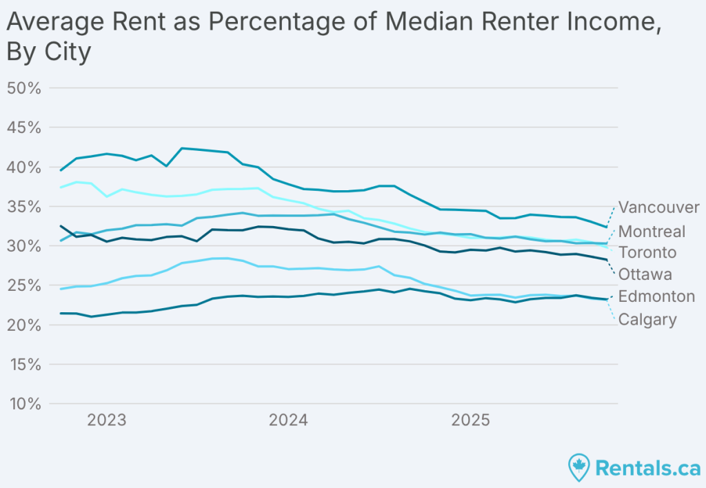 在工資上漲之後,歷史上租金高昂的市場終於出現了租金收入比縮小的趨勢。2025年10月,BC省的平均租金需要租房者收入中位數的30.6%,安省則為30.5%,這已接近可負擔性臨界點。