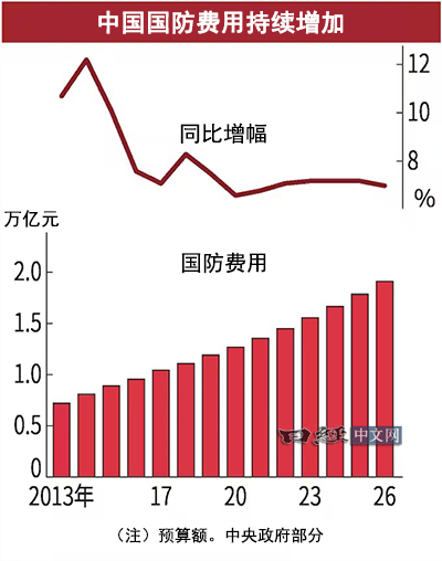 国防费用已被写入3月5日开幕的全国人民代表大会审议的2026年预算案。增幅高于政府工作报告中提出的2026年实际经济增速目标“4.5%~5%”。