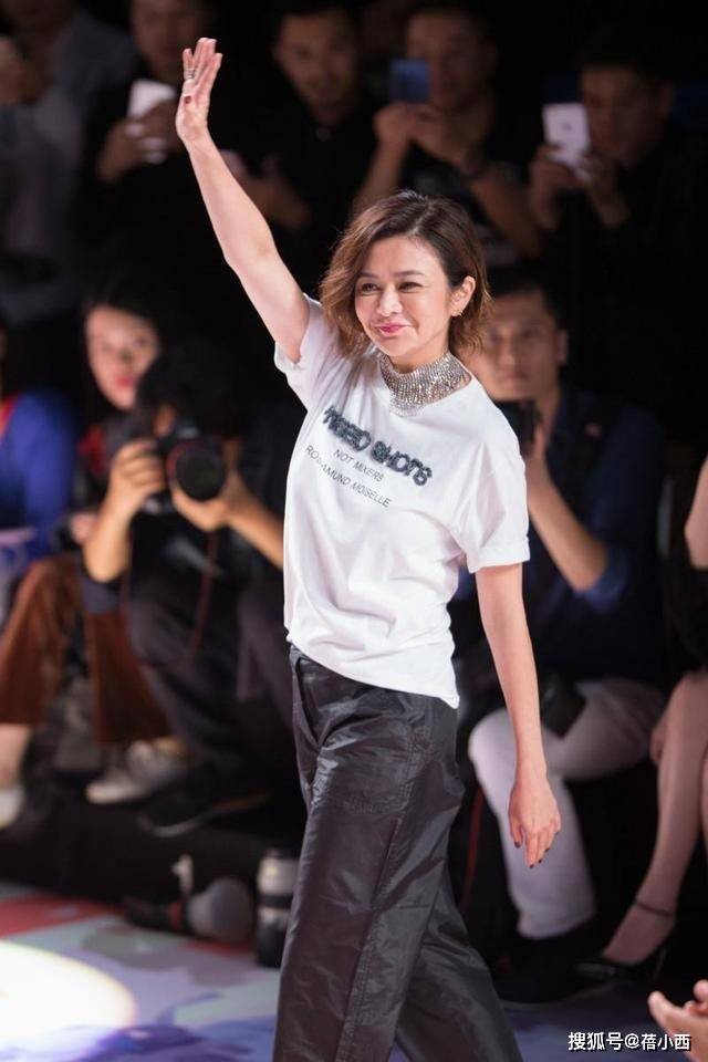 63岁关之琳罕见走T台,穿白t恤+阔腿裤+微卷短发
