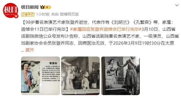 3月10日,山西省话剧院微信公众号发布讣告称,山西省话剧院着名表演艺术家,一级演员,山西省戏剧家协会会员张登乔同志,因病医治无效,于2026年3月9日19时30分在太原逝世,享年98岁。