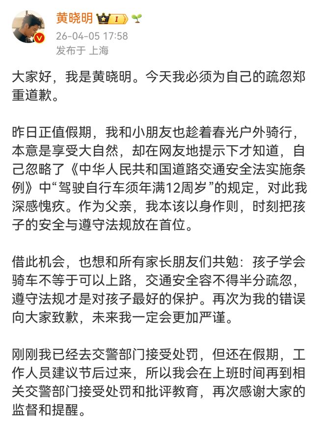 清明节假期,艺人黄晓明首次公开分享与9岁儿子小海绵的春日骑行合照,结果评论区瞬间成普法现场,引发网友热议!