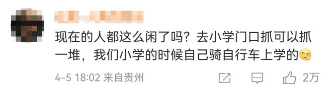 也有人认为这届网友管的太宽了:“现在的人都这么闲了吗?去小学门口抓可以抓一堆,我们小学的时候自己骑自行车上学的。”