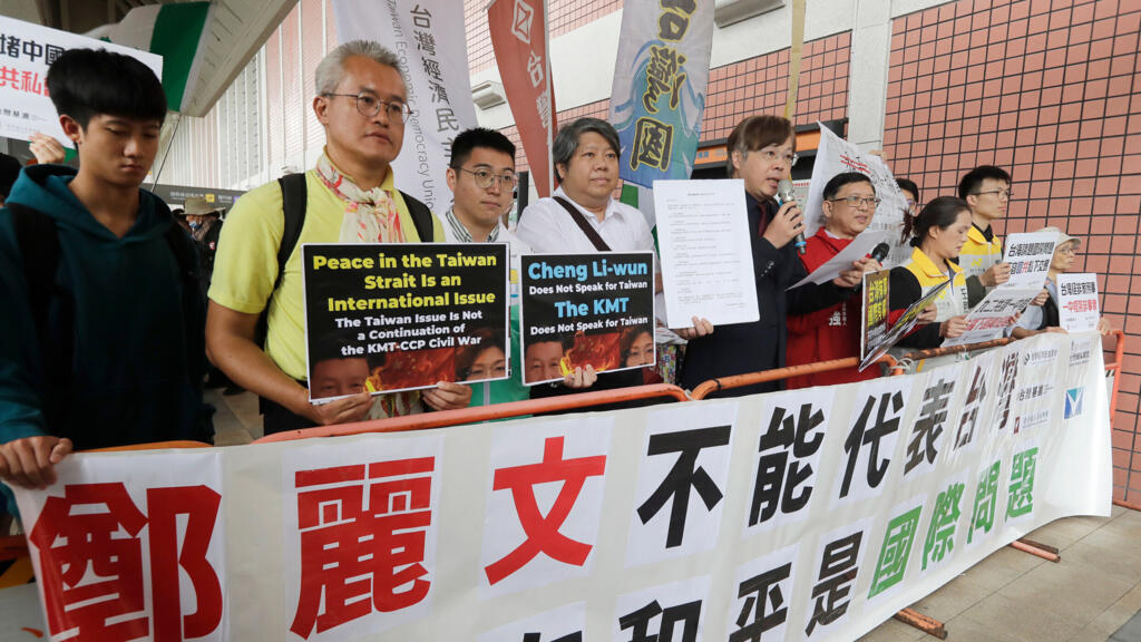 2026年4月7日星期贰,在台灣台北松山機場外,抗議者舉著標語,阻攔台灣主要反對黨國民黨主席鄭立文前往中國大陸。