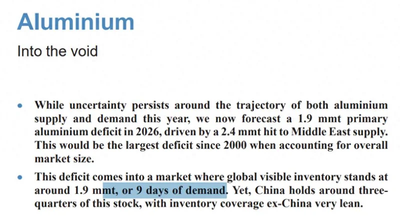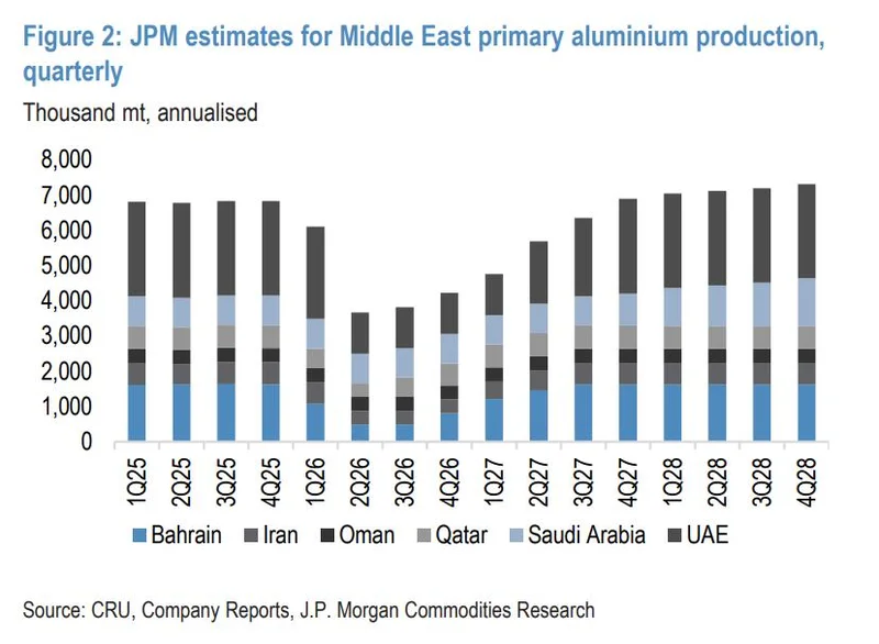 综合来看,摩根大通预计中东铝产量2026年同比下滑36%,损失约240万吨;2027年仍将比冲突前预测少产约95万吨。
