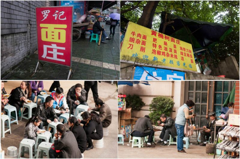 重庆小面面摊一般都没有什么像样的店面,街边巷尾,居民区内,黄角树下都可能有面摊;人们完全不在意环境是否舒适,在意的只是味道到底这么样。只要味道好,站着也吃得下。在重庆的街头,你常常会看到这样一幕,一面摊前,人们把高点的凳子当桌,低点的凳子当坐西里呼噜的吃着一碗红彤彤的小面,不管你是大款还是“棒棒”,待遇都是一样。