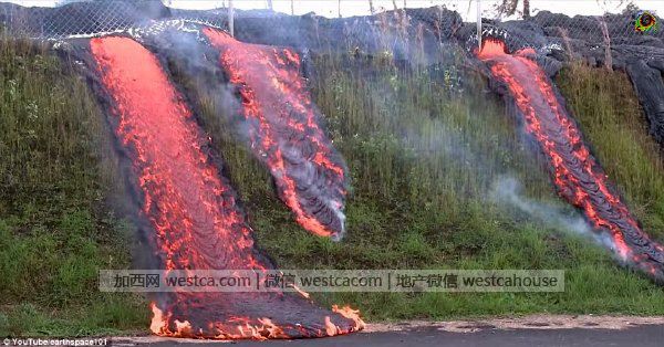 一段早先的录像显示,有三股火山岩浆穿过一座废物回收设施的金属栅栏,并逐渐融合交汇,形成多个“红色瀑布”