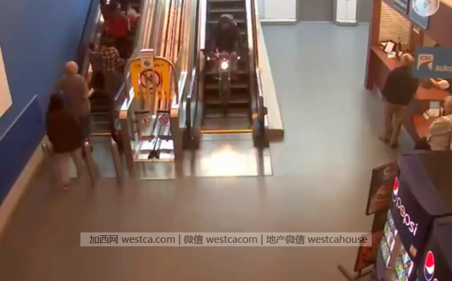 骑着重机的男子,从吉尔福德中心商场的手扶梯一路骑下楼。(取材自LiveLeak)