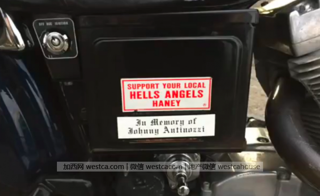重机上贴有支持黑帮组织「地狱天使」的贴纸。(取材自LiveLeak)