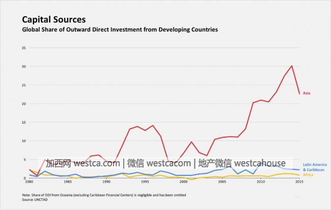 世界贸易组织(WTO)十分自然地成为了这一多边投资协定的谈判平台。在此前的多边投资协定谈判中,发达国家反而比发展中国家获得了更多的优待和特权,这是各方暂未能够达成多边投资协定的原因之一。在过去十年间,全球投资环境发生了剧烈变化,因此各国应该重启多边投资协定的谈判。如下图所示,发展中国家的对外直接投资已经占到全球对外投资总额的近四分之一。这意味着一些新兴经济体已然成为了资本输出国,它们将在未来全球投资体系中扮演重要角色。
