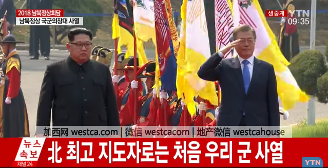 海外网4月27日电27日,朝韩边境板门店,朝鲜最高领导人金正恩在韩国总统文在寅陪同下,检阅了韩国三军仪仗队。这是朝鲜最高领导人第一次检阅韩国军队。
