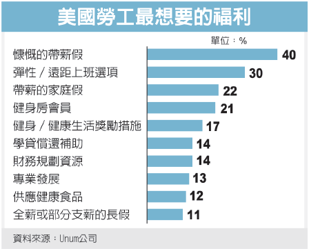 员工福利保险公司 Unum最近网上调查1,500名在职人士发现,求职者最想找的是工作有弹性且休假多的职缺。调查发现,休假多持续高居榜首,不过,学贷偿还补助以及健身房会员和办公室供应健康食品在内的生活福利,也渐渐成为谋职者看重的公司福利。