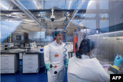 资料照:武汉病毒研究所的病毒学家石正丽(左)在该所的P4实验室内。