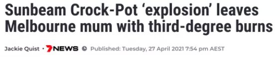 就在Sarah准备打开高压锅锅盖时,高压锅突然像烧完了引线的炸弹,“砰”地一声在她的面前爆炸,滚烫的汤水瞬间覆盖在她的衣物和皮肤上。