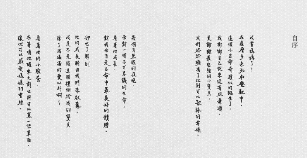 這篇自序由志玲姐姐手寫,字跡靈秀灑脫,有壹定的筆墨功力,而這也是她寫給兒子的心裡話: