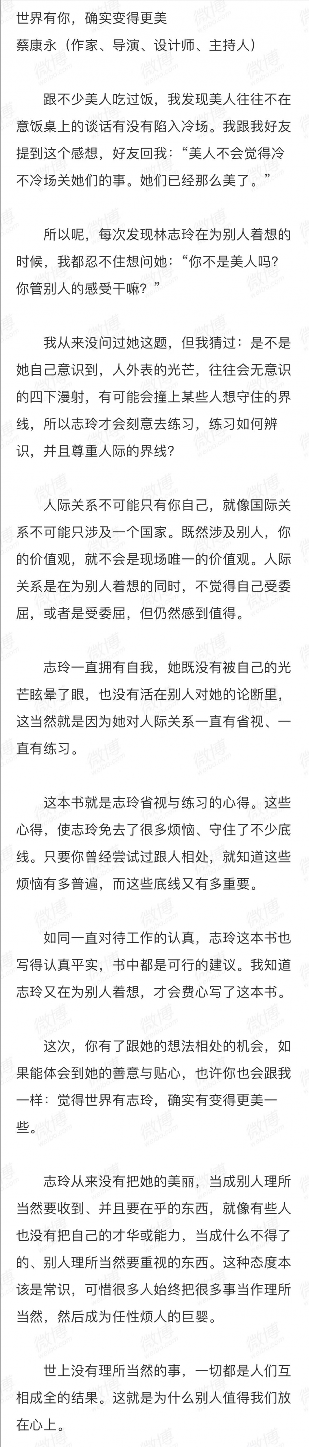 其中,蔡康永大贊林志玲總在為別人著想,“志玲從來沒有把她的美麗,當成別人理所當然要收到、並且要在乎的東西,就像有些人也沒有把自己的才華或能力,當成什麼不得了的、別人理所當然要重視的東西……如同壹直對待工作的認真,志玲這本書也寫得認真平實,書中都是可行的建議。我知道志玲又在為別人著想,才會費心寫了這本書……”