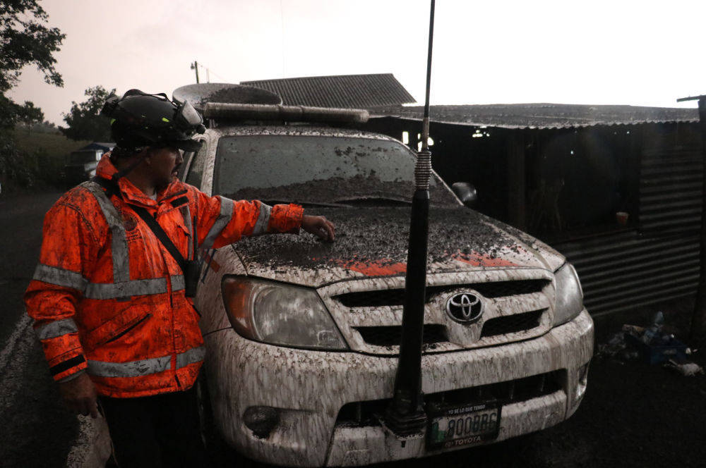 2018年6月3日,在危地馬拉奇馬爾特南戈省的阿卡特南戈,壹名救援人員站在落滿火山灰的車輛旁。新華社發
