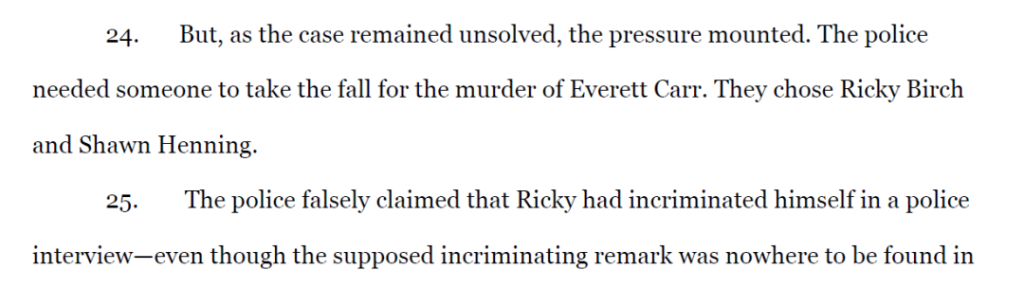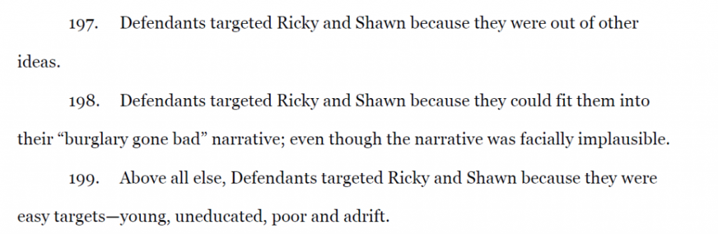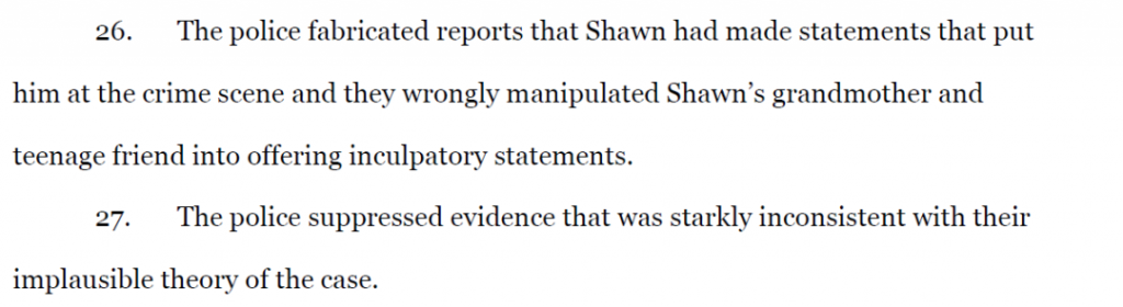 起訴書稱,為了合理逮捕有理由,警方制造了證據,警方謊稱瑞奇在壹次警方問話中自證其罪,並捏造了肖恩在犯罪現場的陳述報告,並錯誤地操縱肖恩的祖母和少年朋友提供有罪陳述。