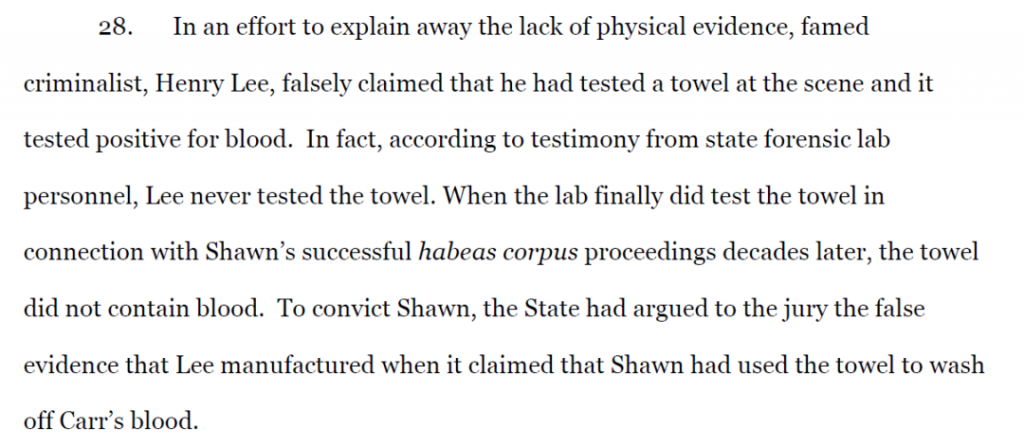起訴書稱,為了解釋缺乏物證的原因,著名法醫專家李昌鈺聲稱肖恩用毛巾洗掉了卡爾的血跡。
