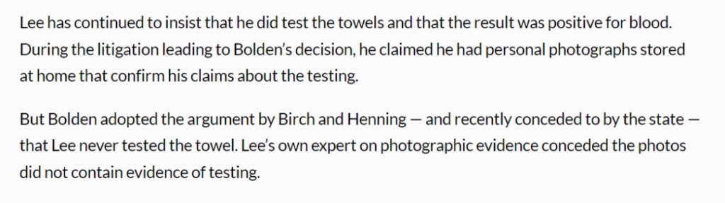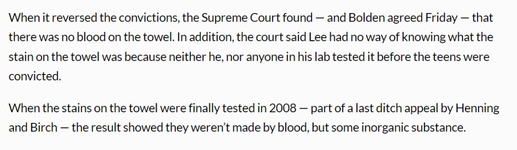 法院表示,李無法知道毛巾上的污漬是什麼,因為在青少年被定罪之前,他和他實驗室中的任何人都沒有對毛巾進行測試。