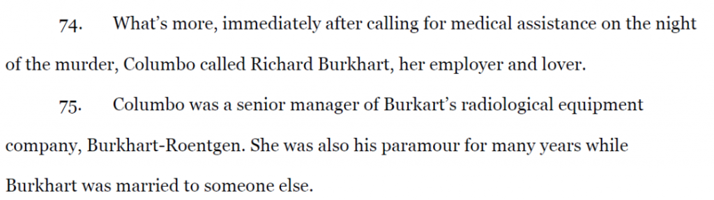 更重要的是,案發當晚,科倫坡在報警後,立即給她的雇主兼情人理查德-布克哈特打了電話。科倫坡是布克哈特公司的高級經理,然而明知上司已婚,她還跟他偷情,爸爸卡爾壹直反對女兒這段婚外情。