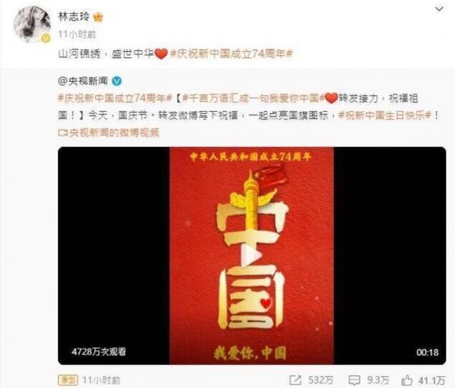 但令人傻眼的是今年10月1日林志玲搶先在凌晨12時19分轉發,並寫下“山河錦繡,盛世中華”,搶到頭香。