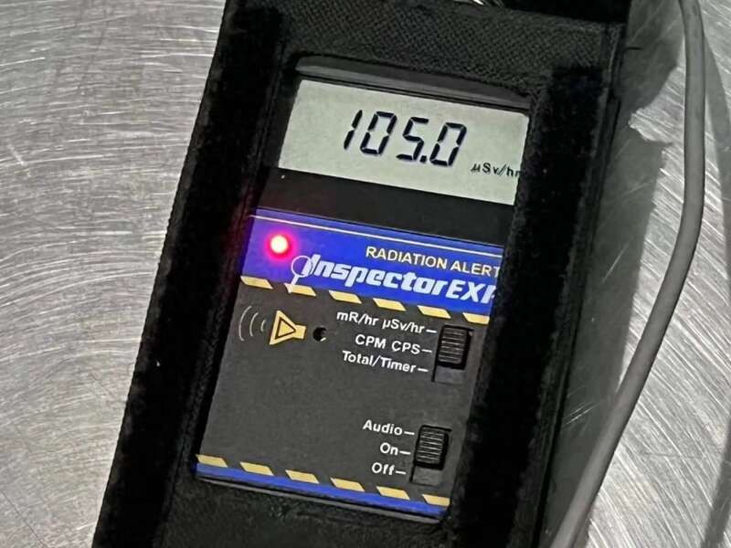 经现场关员复查,该旅客携带的一袋“保健石”核辐射超标,辐射量达105微西弗每小时,超出现场本底值1050倍。